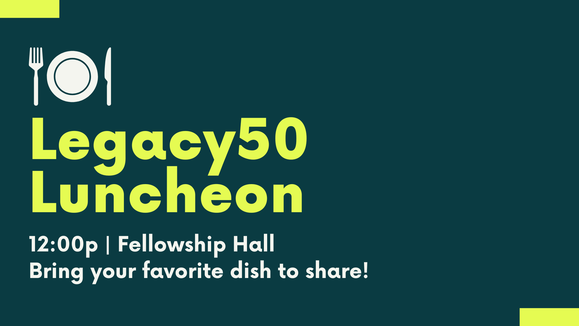 Join us for a Legacy50 Luncheon Potluck on May 18th! We’ll start at 12:00p in the Fellowship Hall. Bring a dish to share!