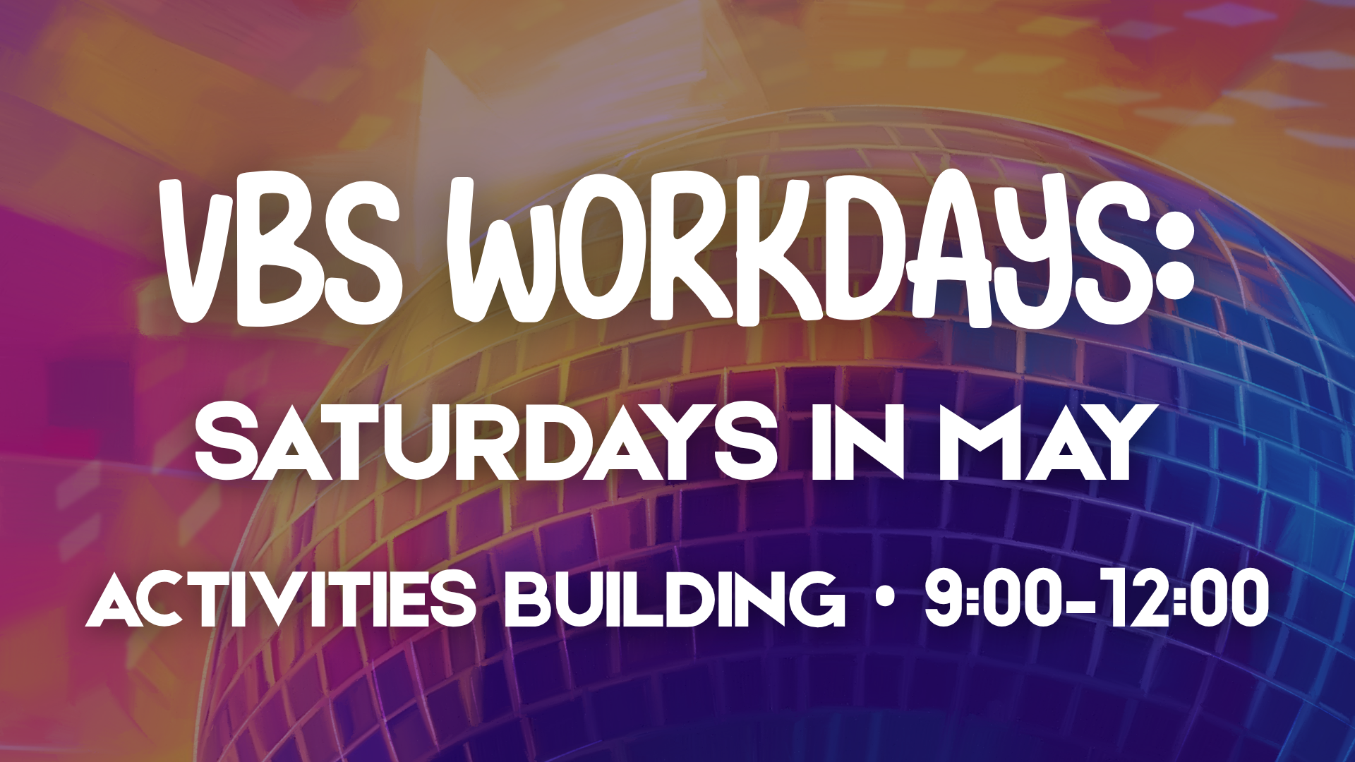 We’ll be in the Activities Building from 9:00a - 12:00p every Saturday in May as we prep the decor and other materials for VBS.