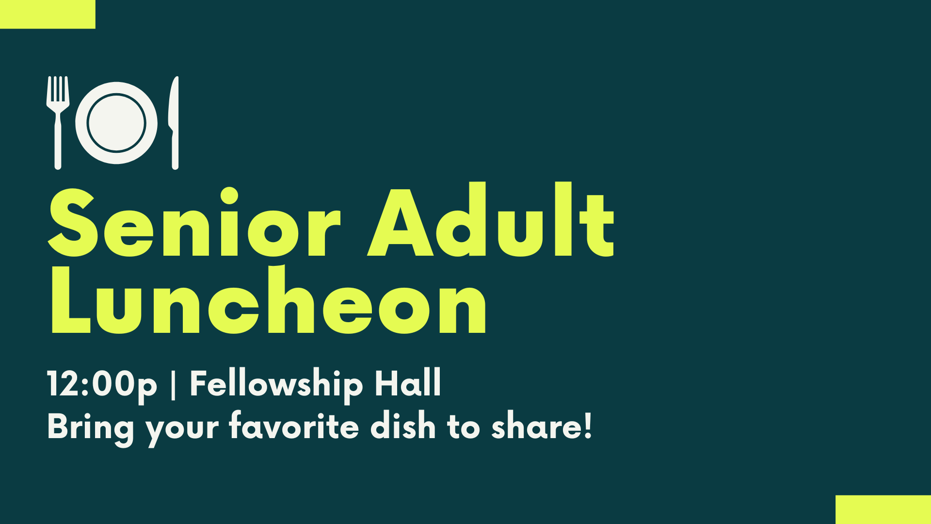 Back to All Events Senior Adult Luncheon Monday, January 26, 2026 12:00 PM 1:00 PM Google Calendar ICS Join us for our next Senior Adult Luncheon! We’ll meet at 12:00p in the Fellowship Hall. Bring your favorite dish to share! Questions about this event? Contact Debbie Ivey: divey@firstbaptist.net.